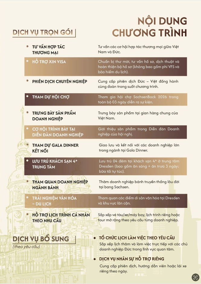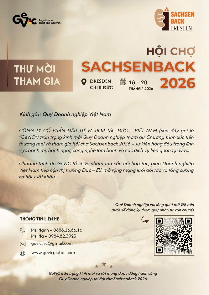 SACHSENBACK 2026 là hội chợ ngành bánh mì, bánh ngọt, công nghệ làm bánh và các dịch vụ liên quan, tổ chức 2 năm/lần tại Messe Dresden. Sự kiện quy tụ 200+ doanh nghiệp triển lãm và 10.000+ khách tham quan chuyên ngành, bao gồm tiệm bánh, nhà sản xuất nguyên liệu – thiết bị, chuyên gia patisserie, đại lý phân phối, nhà hàng – quán cà phê và các đơn vị F&B.